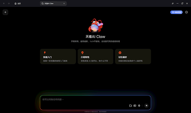 一体多端,设备全覆盖。天禧Claw全端可用,支持PC、平板、手机版本,跨设备协同使用,在哪都能聊,换设备不中断。